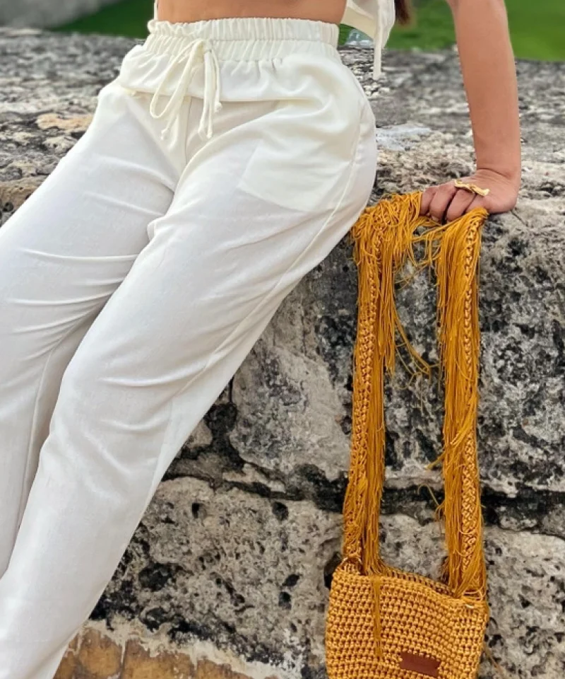 Bolso tejido en crochet y flecos.