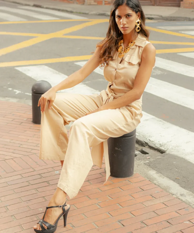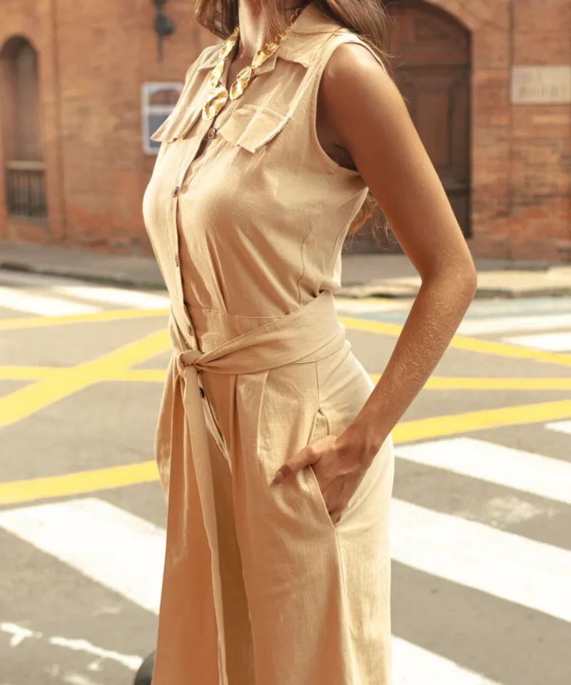 Enterizo de lino con pantalón de bota ancha y pretina lisa, terminado con botón de pasta en color café. Detalles de alta costura que aportan un estilo sofisticado y moderno.