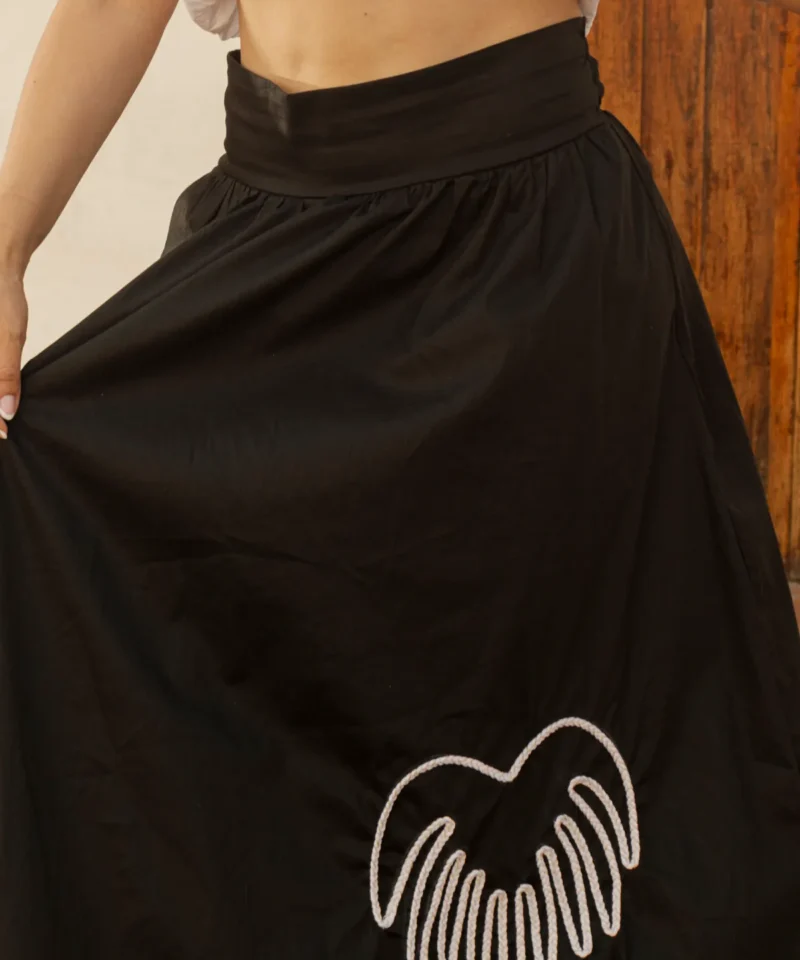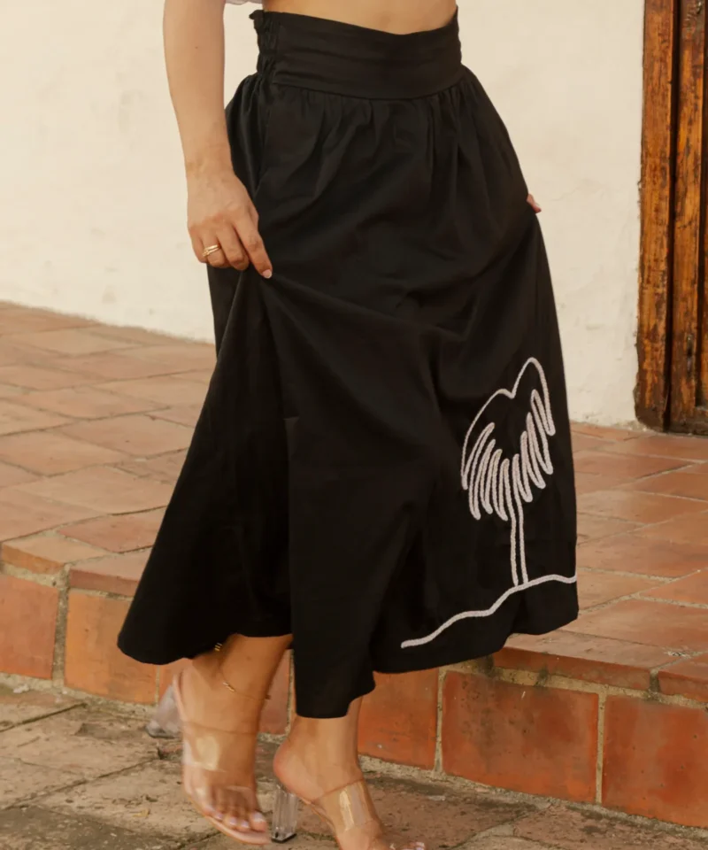 Falda campana en popelina con pretina lisa en el frente y pretina enresortada en la parte trasera. Terminados de alta costura con palma bordada que añaden un detalle artesanal y elegante.