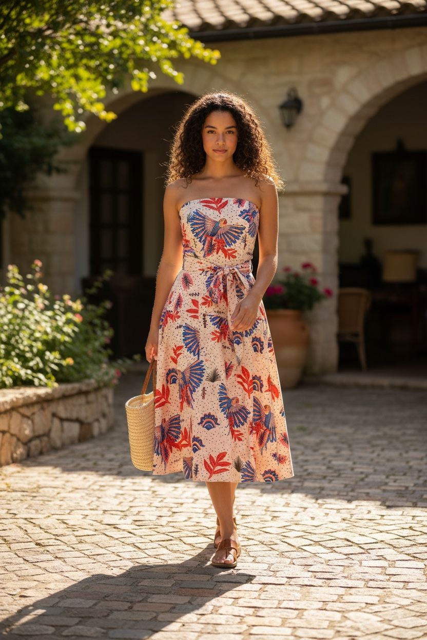 Este vestido evoca libertad, feminidad y sofisticacion natural. Su diseño strapless realza delicadamente el escote y los hombros, mientras la silueta midi aporta equilibrio y elegancia atemporal.