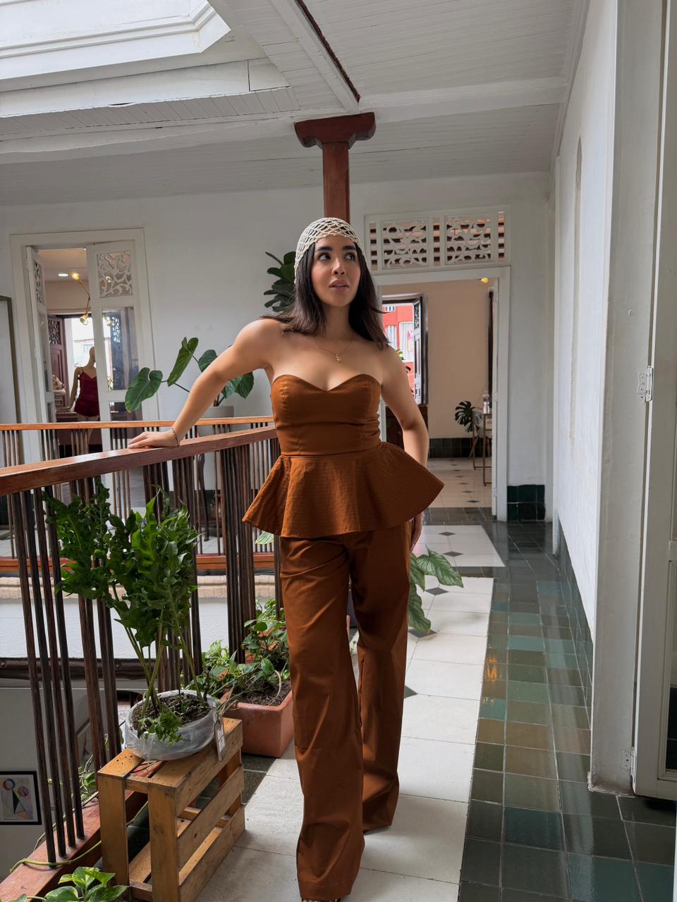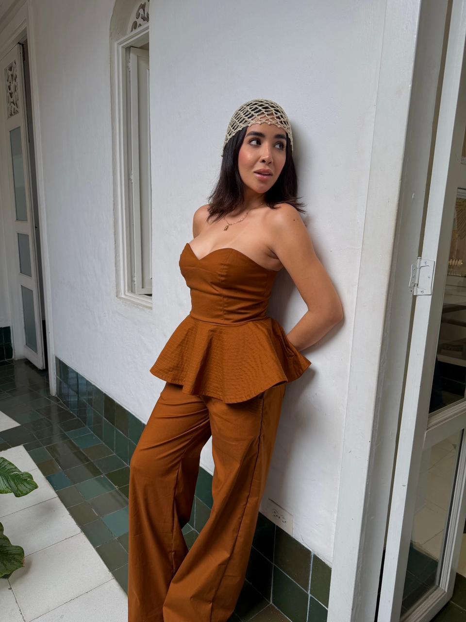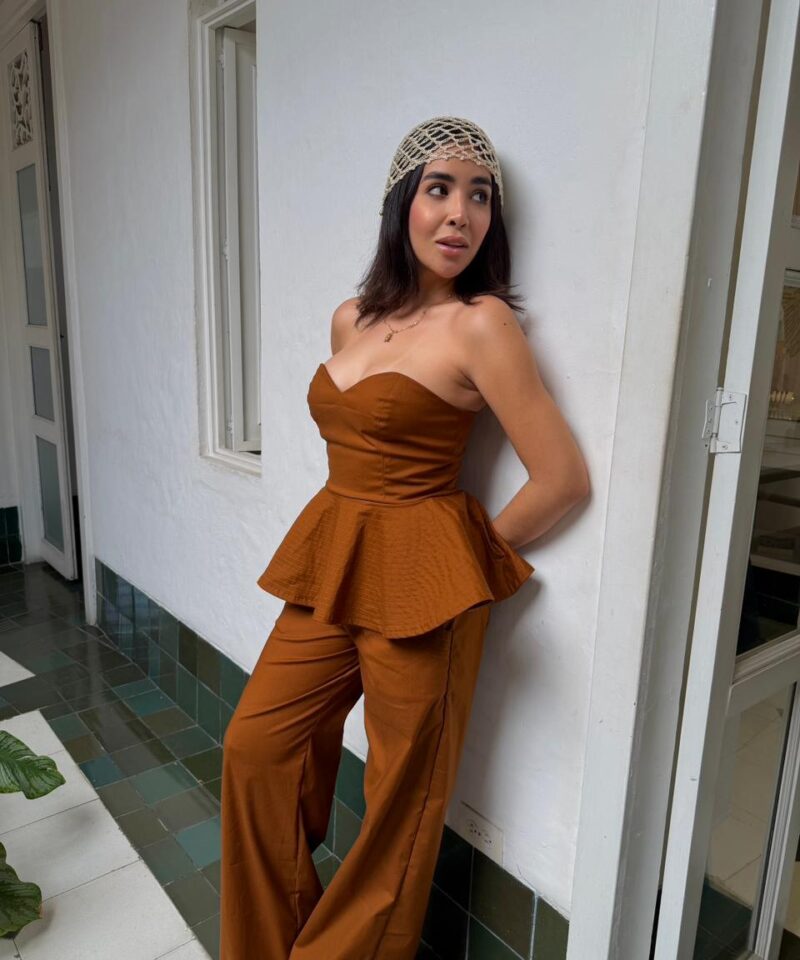 El top con escote corazón y peplum sutil define la cintura con delicadeza, mientras el pantalón de caída fluida aporta equilibrio, comodidad y un porte impecable. Cada pieza está confeccionada con telas de alta calidad, pensadas para perdurar en el tiempo y acompañarte en múltiples ocasiones, desde reuniones ejecutivas hasta eventos especiales.