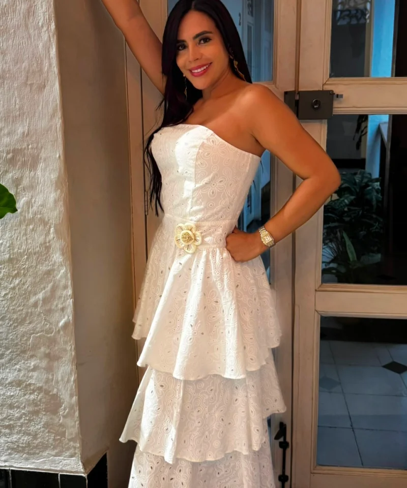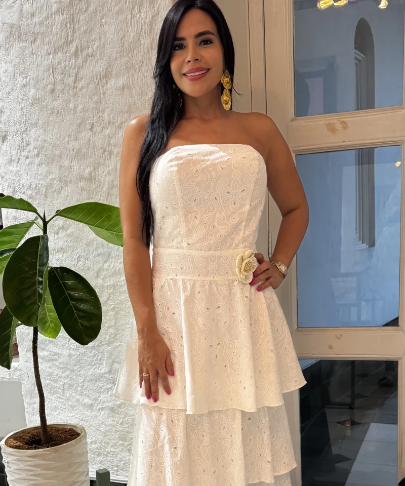 Vestido strapless con falda tres tiempos, confeccionado en tela Hoja Rota. Con acabados de alta costura, esta prenda ofrece una silueta refinada y sofisticada, perfecta para un look elegante y único.