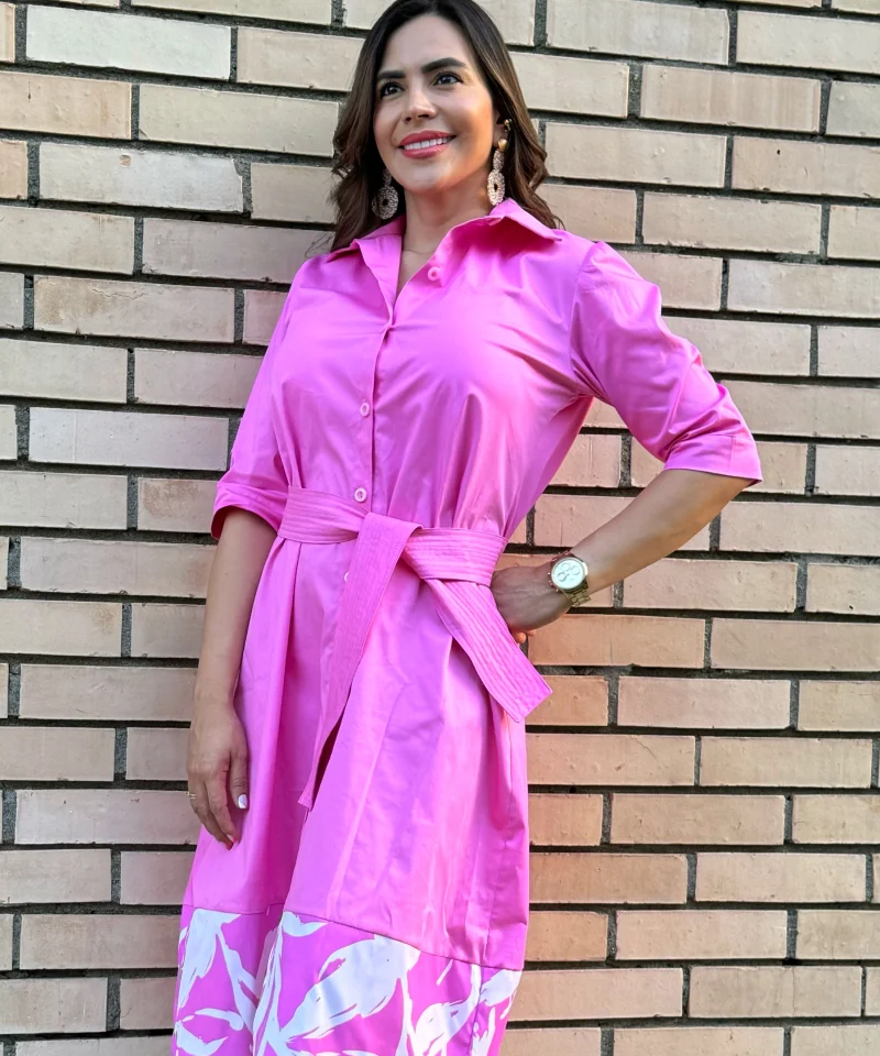 Vestido midi de corte elegante, con botones delanteros y mangas tres cuartos. Su cuello camisero y terminados de alta costura con cinturón pespuntado le dan un toque sofisticado. Fabricado en tela drill, ideal para un look moderno y refinado.
